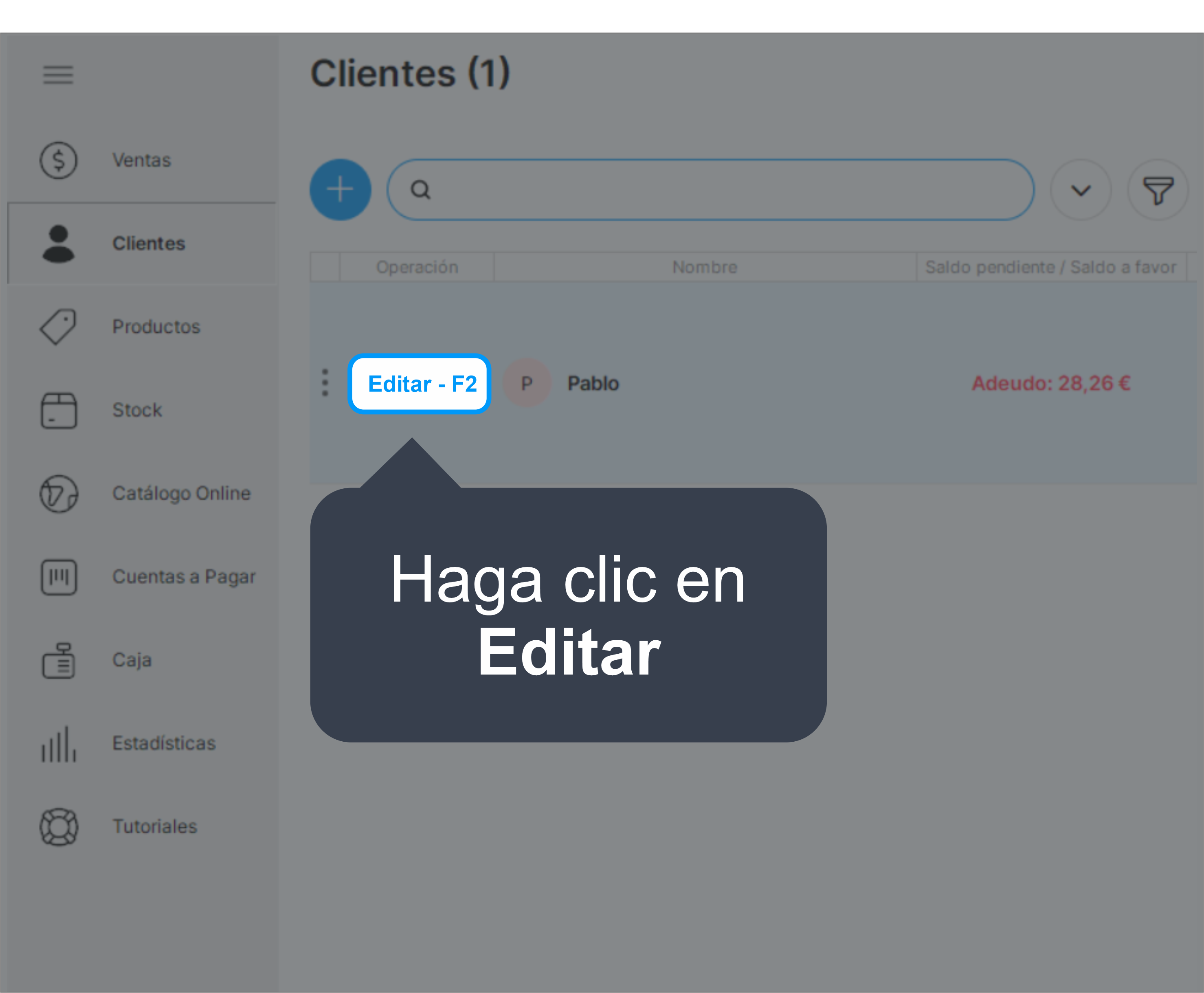 Busque el CLIENTE en la lista de clientes y haga clic en EDITAR.