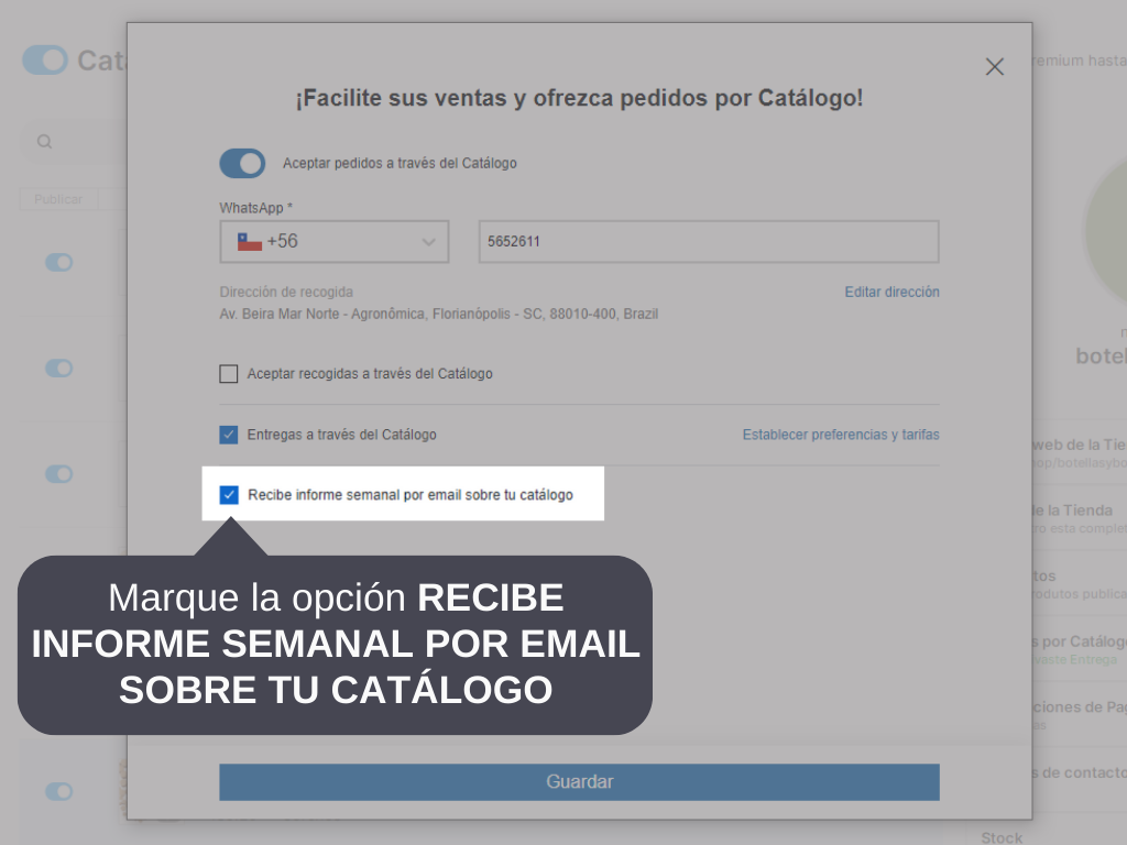 3. Marque la opción RECIBE INFORME SEMANAL POR EMAIL SOBRE TU CATÁLOGO.