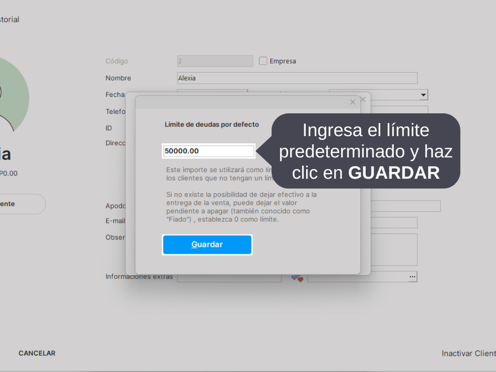 7. Ingresa el monto del LÍMITE PREDETERMINADO y haz clic en GUARDAR.