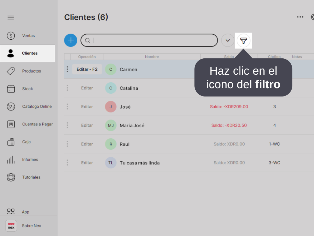1. En la pantalla Clientes, haz clic en el icono del filtro.